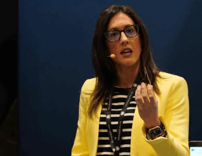 La Dra Beatriz Jáuregui explicando las particularidades técnicas para optimizar los resultados de la ablación de fibrilación auricular mediante campo pulsado (P.F.A.) en una sesión de expertos.
